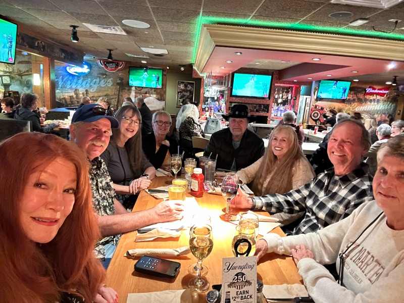 After a quiet New Year’s Eve, spent home with the kids, we prepped for our pal, Bonnie’s visit from Oklahoma. She arrived Sunday the 11th for four nights. Her plan was to have Wyatt bred (frozen) for later use. Unfortunately, the plans with the Vet all went awry. The office had openings, but the veterinarian was away for the month of January. It seems the receptionist was not on the ball when making the appointment. Anyway, we had a wonderful time with Bonnie here and met with Diane and Kris at Applebee’s for Monday the 12th. We played some dominoes and the last game Bonnie won. You’ve got to go home a winner!!!