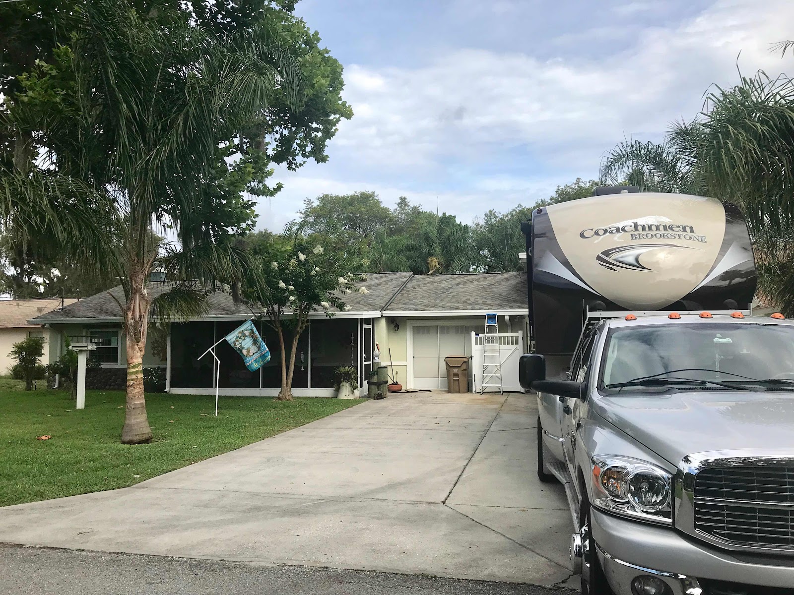 Now at 10:30, the rig is parked in the driveway and Mark is installing the new door. Schweeet. I am waiting to do my part for when the air conditioner does its part. Ha ha. It’s muggy but breezy this morning. (Too warm for me ... I’m a melter!)