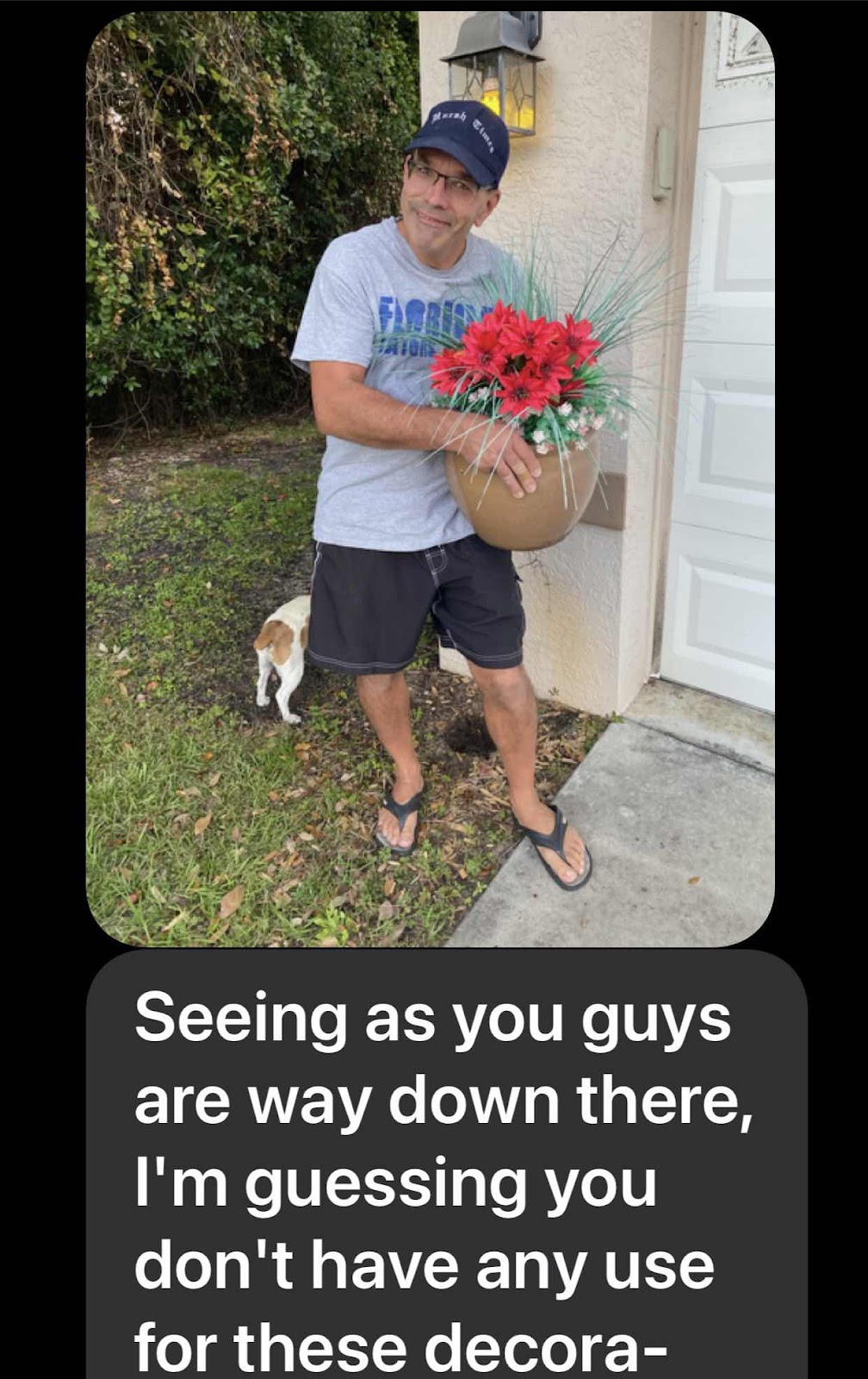 Tonight, while they were dog walking, they picked up a potted plant outside of Jim and roses house. OMG, we’ve had so much fun going back-and-forth with that. Rose and Jim are away at the beach for two weeks. Ha ha ha ha.