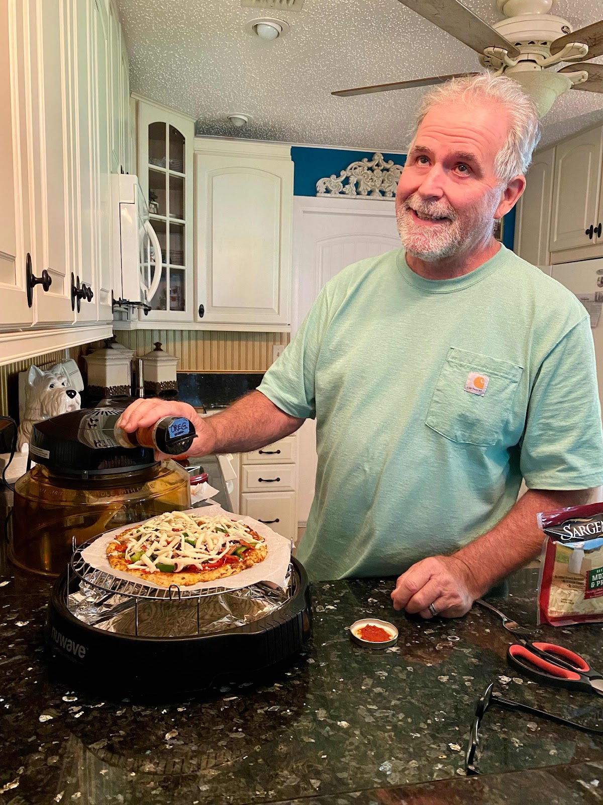 It’s a riced cauliflower crust baked first … then toppings added. Truly experimental … turned out pretty tasty! Good job Mark.