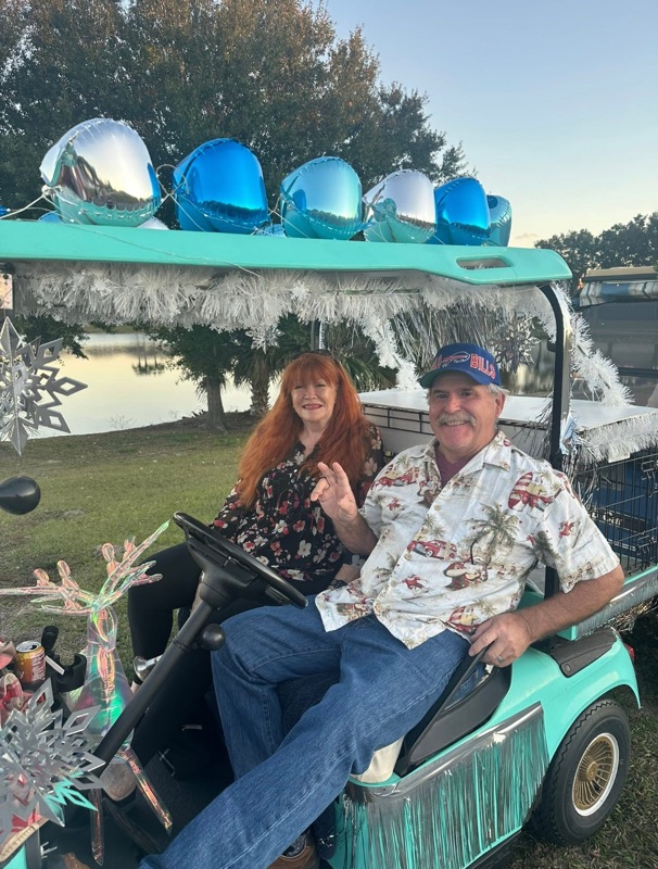 The parade route was 1 1/2 hours long winding throughout the streets. There were people lined up along the roadside and driveway parties to cheer us on. About 200 golf carts paraded! There was a hot chocolate and cookies snack back at our club house plus an hour’s show. What a F U N time!